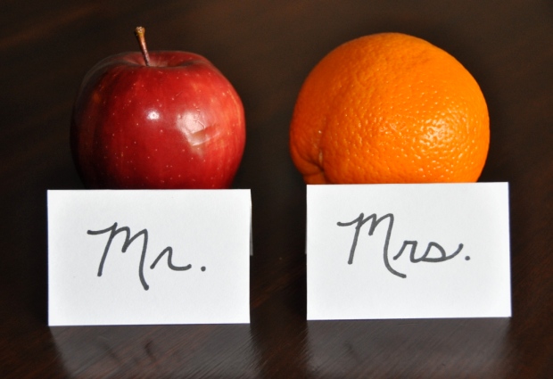 Mrs. Orange is very COMPLEX. When you peel back the first layer of her exterior BeAUtY, there isn’t just more fruit underneath, but MANY different slices of fruit! There’s the slice that feels she could be a better housekeeper, the slice that’s striving to be a better mother, a slice for improving her figure, and of course the slice that feels intimidated by other oranges. There are just a lot of sections of “stuff” under her orange peel, and to be HonEsT, mostly stuff that Mr. Apple doesn’t understand! Mrs. Orange knows that sometimes it is easier on both her and Mr. Apple if she just calls up her friends and works through some of her more troubling segments. Mr. Apple isn’t bothered by this fact, and takes CoMfORT in knowing God intended it to be that way.