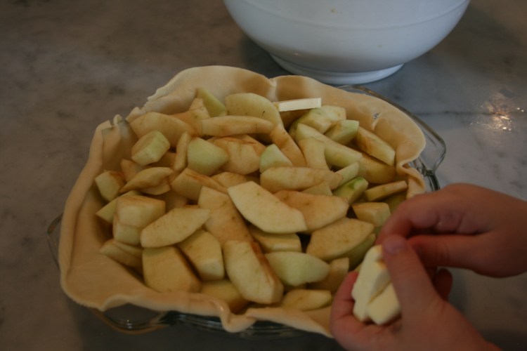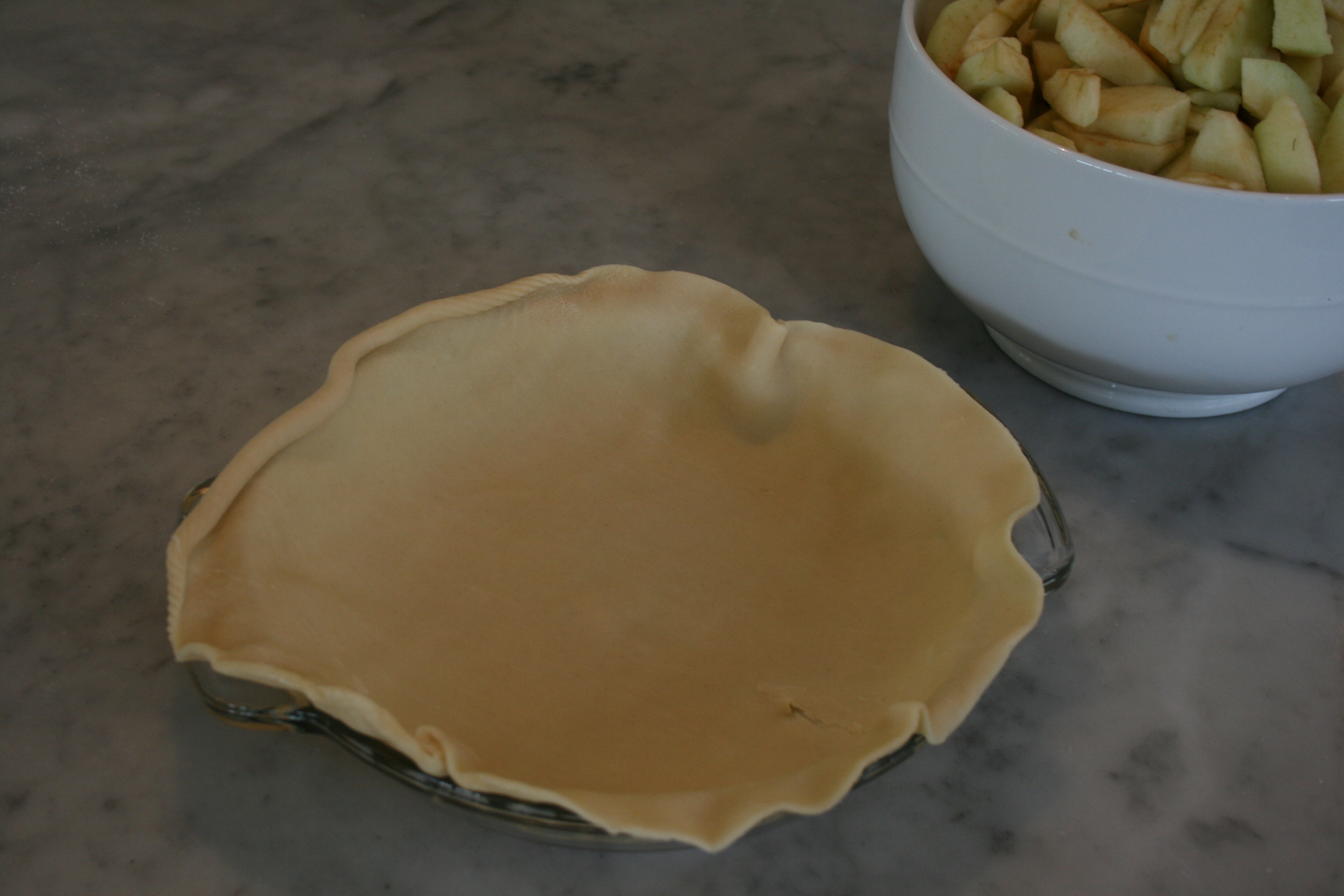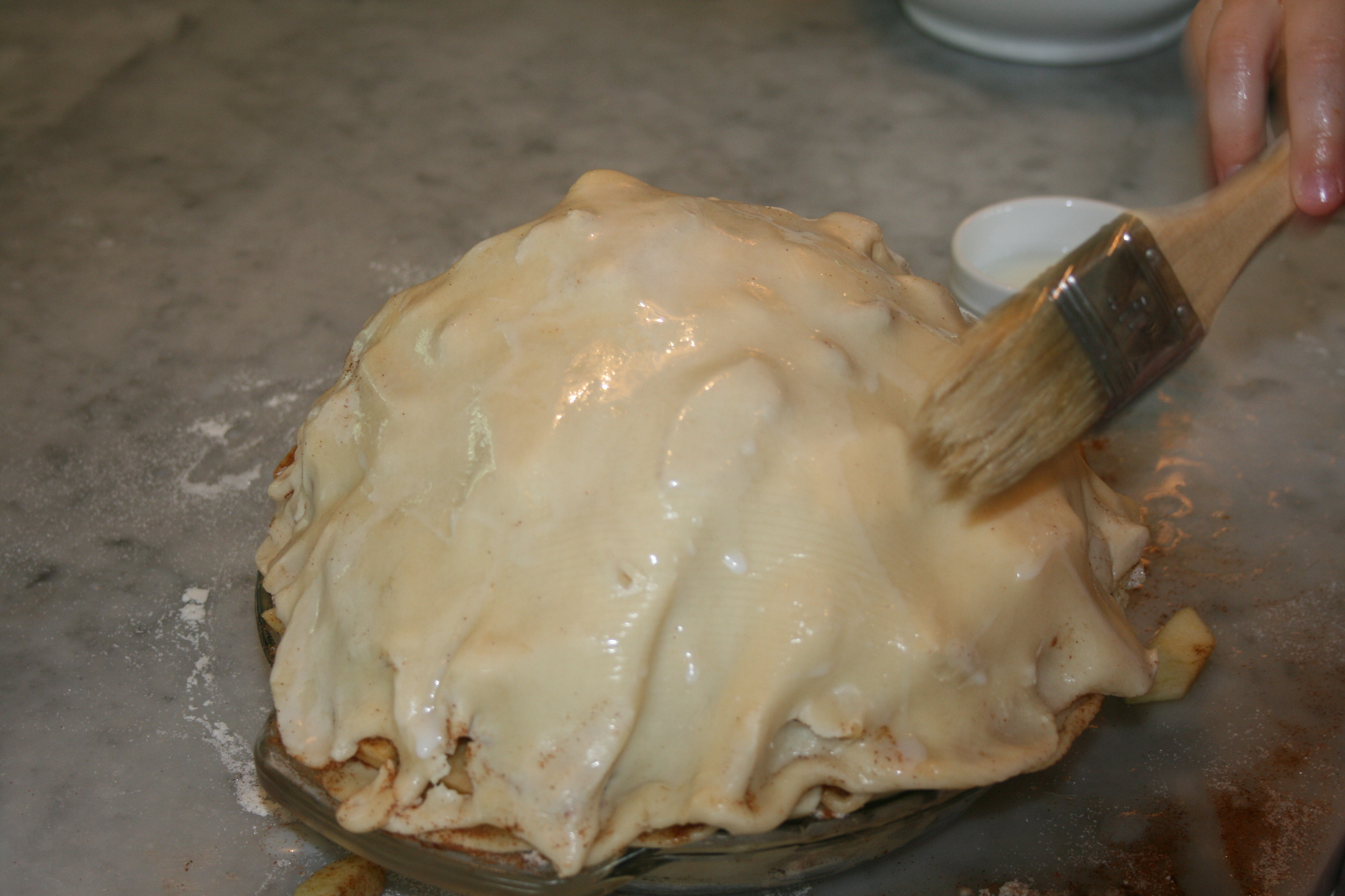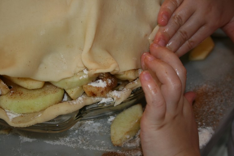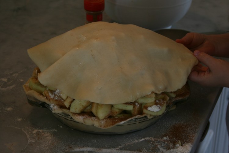 Gently stretch the top pie crust so that it meets up with the bottom crust.