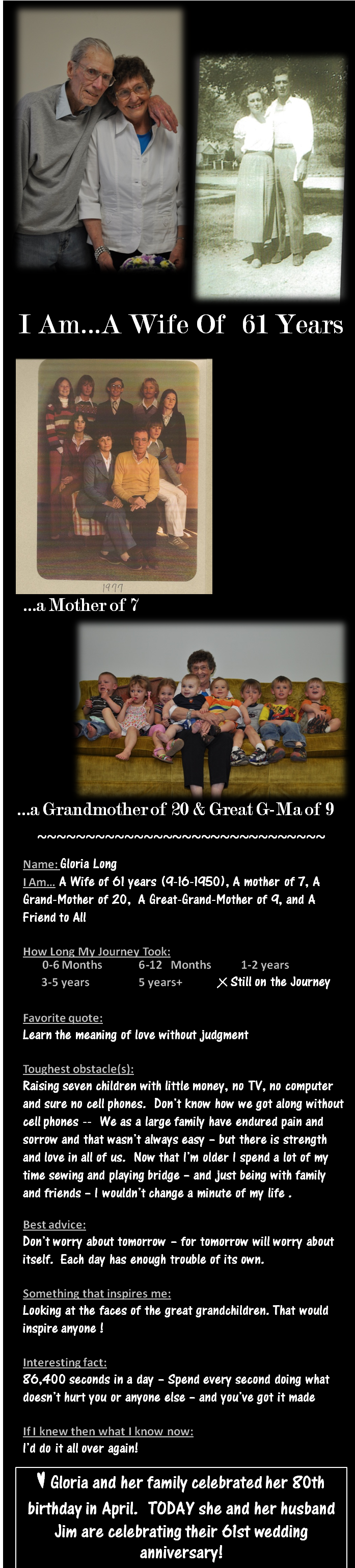 I have had the honor to know this lady for a little over two years. She is a great friend and best of all she is my mother-in-law. Best wishes on your anniversary.