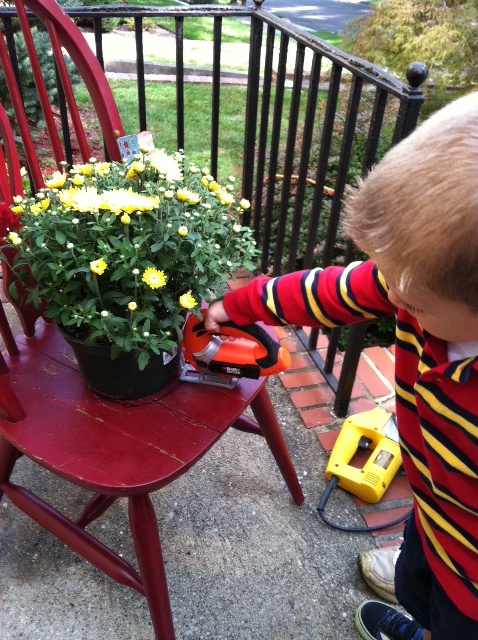 My HuSbAnD (and sOn) drilled a hole through the wood and then used a saw to cut the circle out for my flower pot.