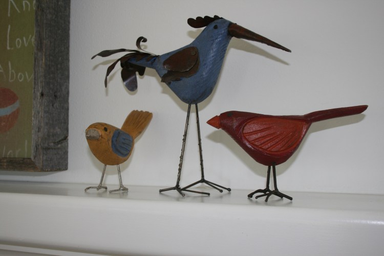 I recently picked up these BiRdS at my town’s fall festival a.k.a. {ArTiSt AllEy}.  I had been looking for birds for my mantle but just hadn’t been real ThRillEd with what I had seen.  Boy, am I so glad that I waited and found these guys.  I love it that they are so UniQuE, colorful (the ones I had been looking at were a metal, bronzy color) and that they were made by an ArEa ArTisT who I know!