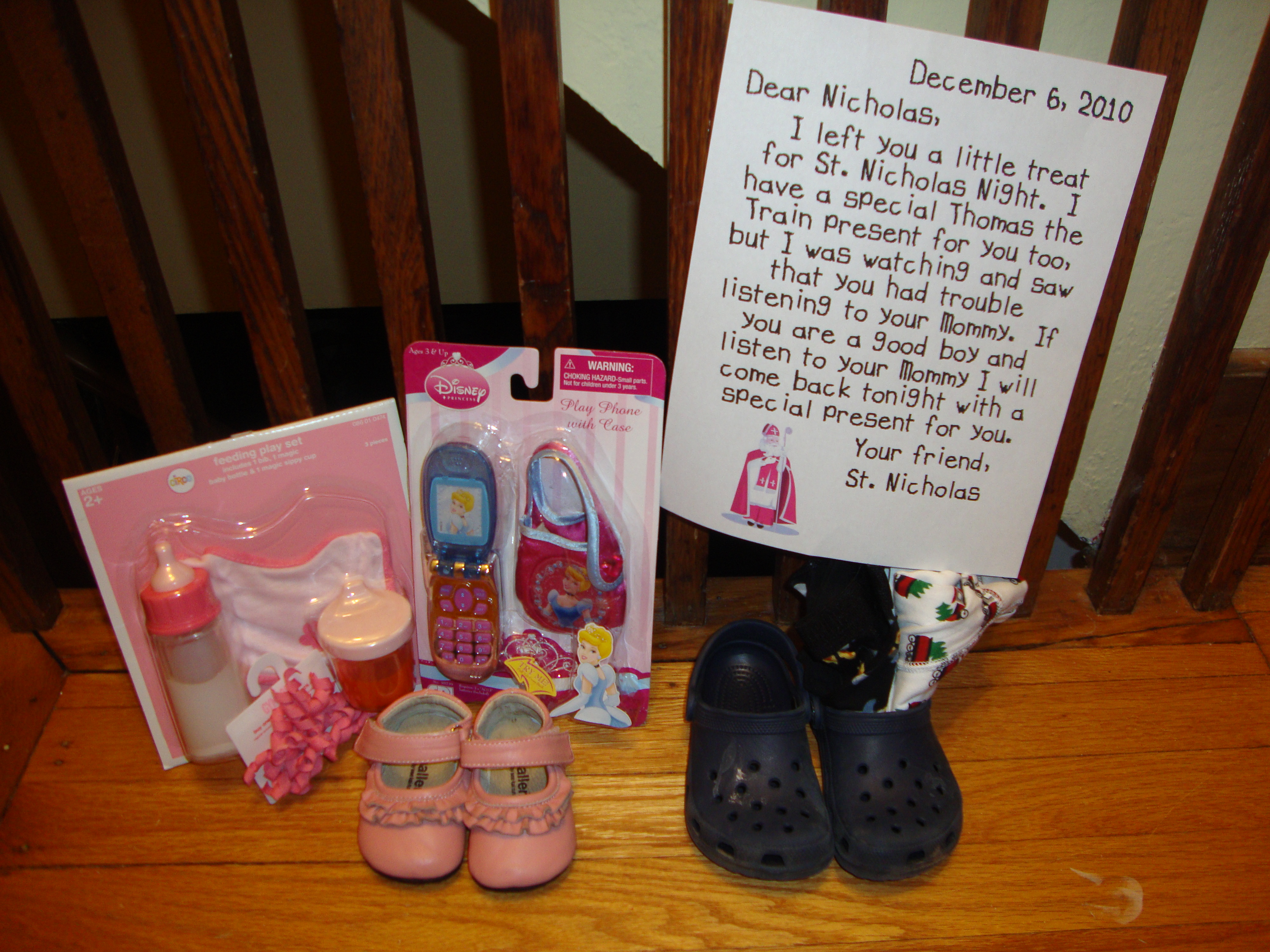 In many European countries, on December 5th, the eve of St. Nicholas Day children leave their ShOeS outside of the bedroom doors and wait for St. Nicholas to leave them a surprise. I have my children do the same thing with their favorite shoes and I love to see their excitement when they wake up in the morning to find that St. Nicholas has visited our home. I feel this is a great way to “KiCk OfF” the holiday season and teach my children about a Saint who was so giving to little ones like themselves. You can read more about St. Nicholas at www.stnicholascenter.org.