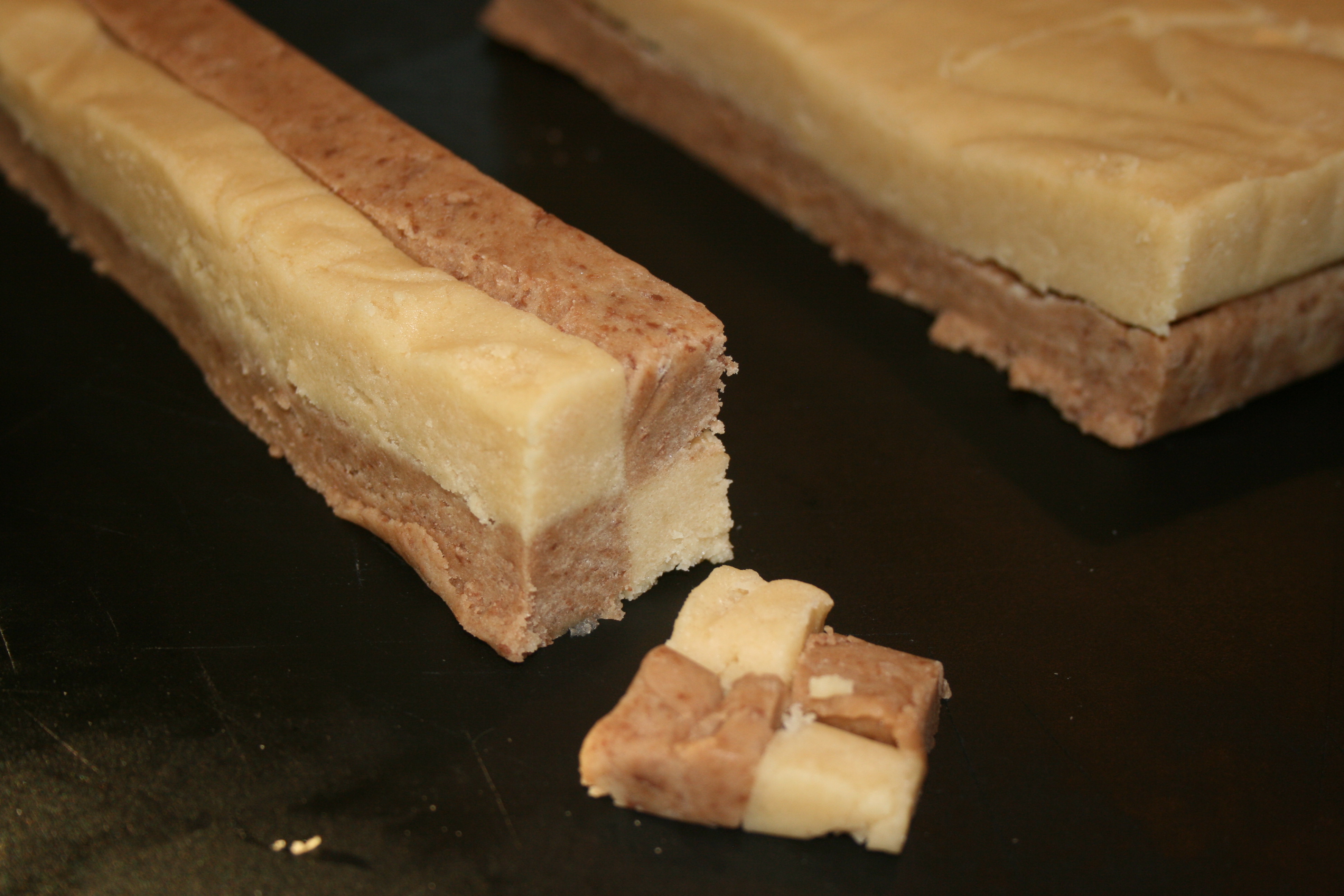 With a long knife cut down through the two layers (about 1/2 inch wide strips). Take two of these strips and place as shown in the above pic. Then slice and bake in a 350 degree oven for 8-10 minutes.
