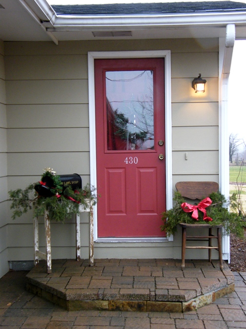 I trimmed up our cedar trees for some FREE decor and added some extra ribbon I had around the house.  The chair and white table were found in my basement and I used some leftover stencils to paint the numbers on the door.  What do think of the traNsformAtion?