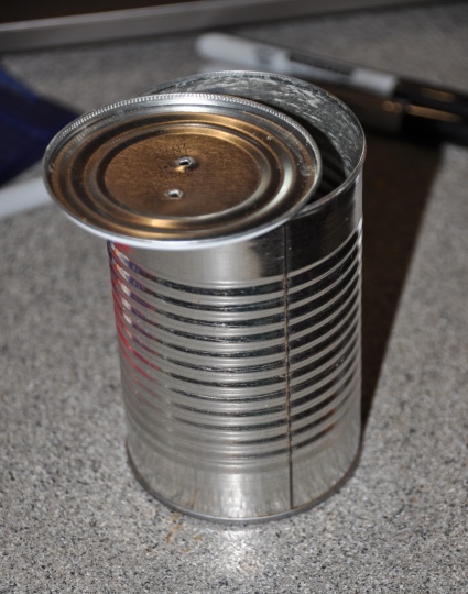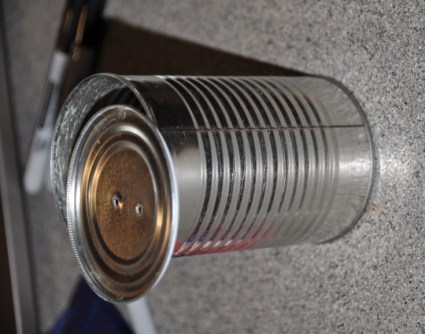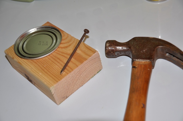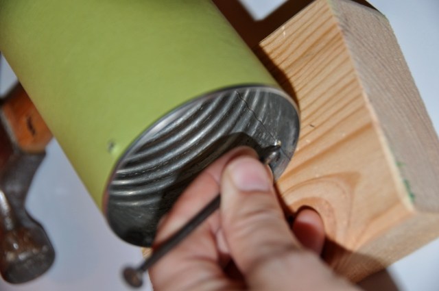 Use decorative paper to wrap around the can.  Secure with tape.  Hammer two holes on opposite ends of the top of the can…