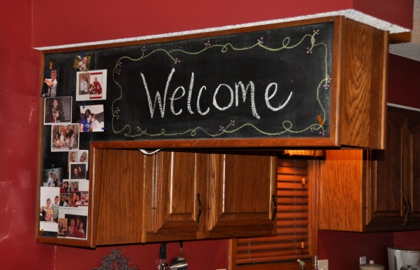 So…I bought Rustoleum Magnetic Paint and Chalkboard Paint.  I applied the magnetic paint with a brush first,  let it dry, and then applied the chalkboard paint.  Now it is a place to hang pics and cards as well as write messages to our family!