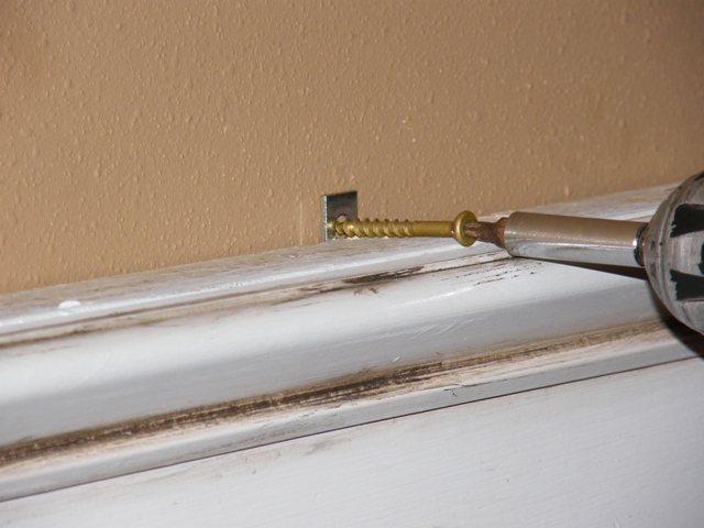 To secure the bottom of theheadboard, we took a 2x3 and drilled it into the wall. We sat the door on top of the 2x3 & screwed them together. For the top, we attached these brackets to the back of the door and then screwed the top of the bracket into the wall.