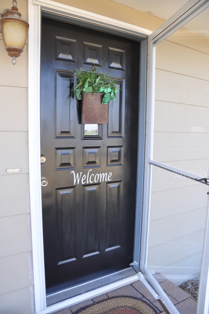 I bought some vinyl and cut out “Welcome” with my stencil machine.  I am really pleased with how it turned out.  To think–Leanne and I were able to tRaNsForm the door in less than an hour (during Garrett’s nap)!
