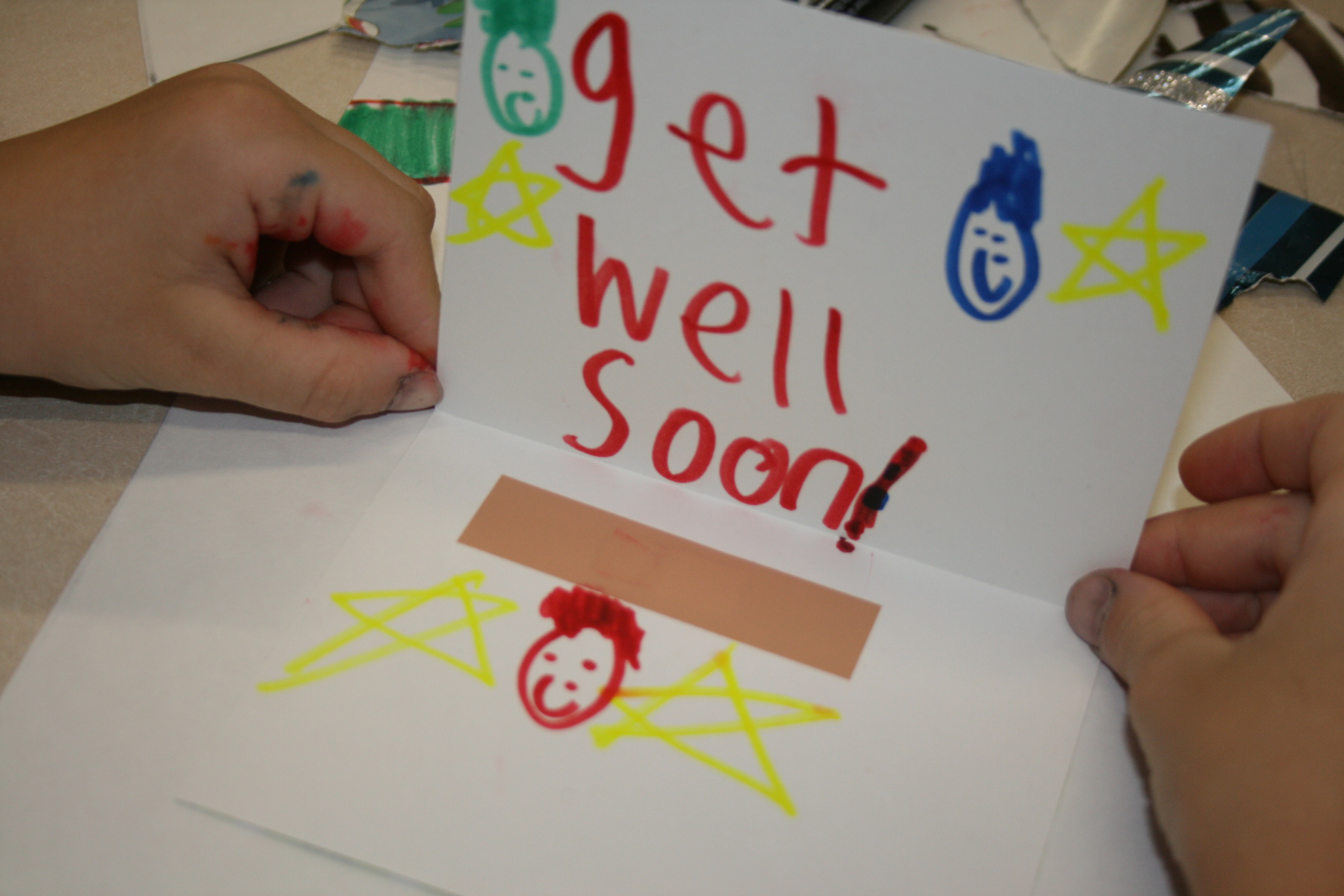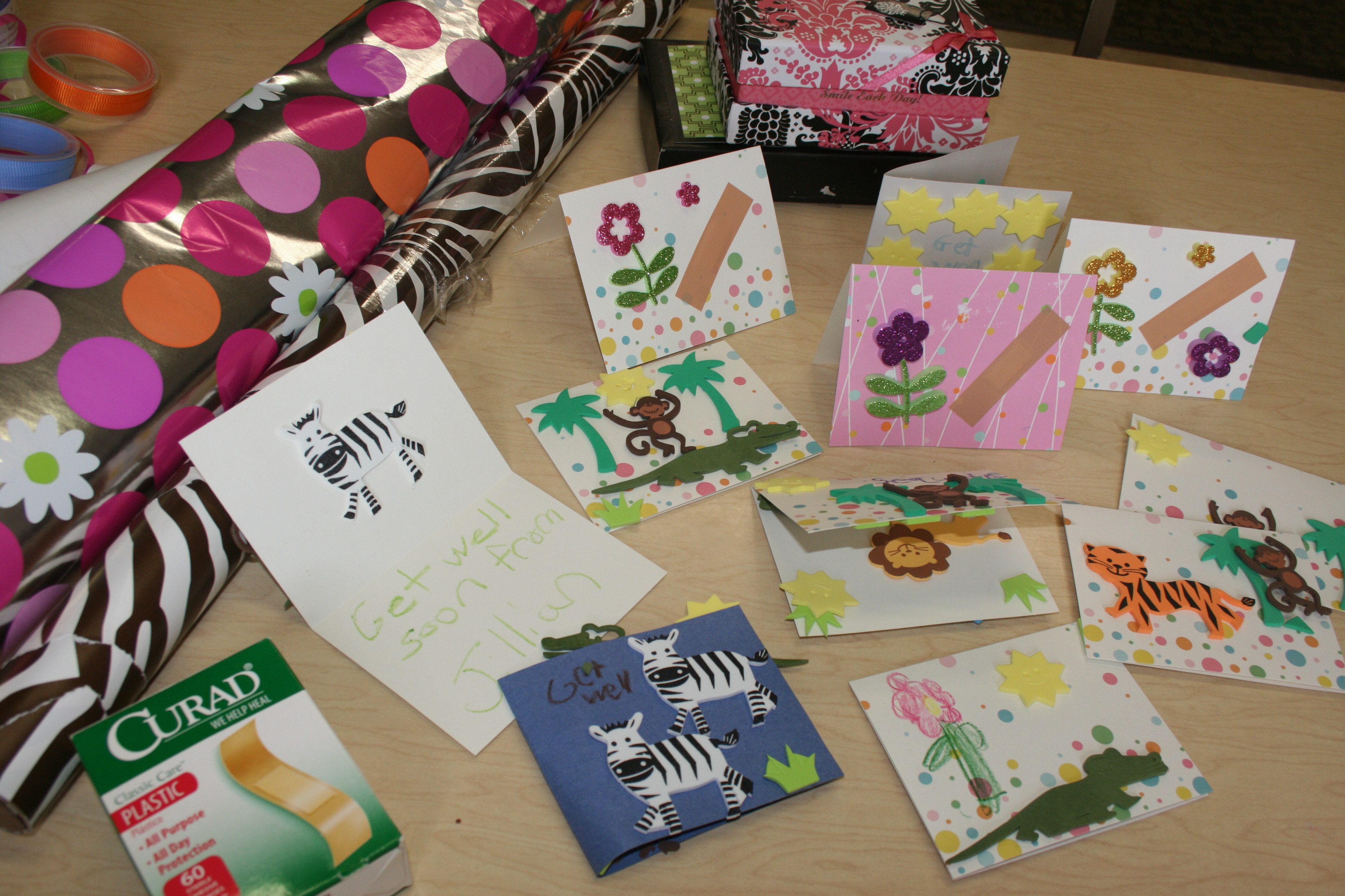 We start off with card stock paper or blank cards. Then DeCoRaTe with foam stickers & bandaids, sign our name, and wish them well. I deliver them to our town’s hospital where they are placed on patient’s meal trays. The hospital PR person tells me they especially like to receive them on holidays such as MoThEr’s DaY, FaThEr’S DaY, Christmas, etc. It’s easy and is a simple way we can give to those less fortunate than us!!