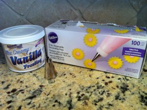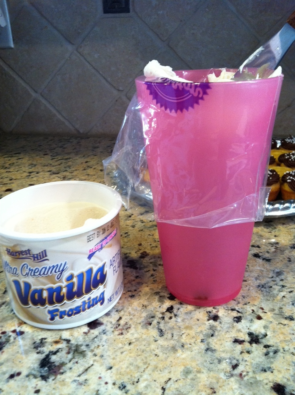 Use your favorite store-bought icing, disposable cake decorating bags, and a large-sized decorating tip.Cut the tip off of the disposable decorating bag and slide the decorating tip to the end of the bag.Fold the plastic decorating bag over the edge of a cup so that your hands are free to scoop the icing into the decorating bag. Once you have filled the bag with icing simply take it out of the cup to use.Squeeze the icing to the tip of the bag when you are ready to decorate the cupcakes.Start on the edge of the cupcake and move in a circular or spiral motion ending in the middle of the cupcake.Add toppings and serve!
