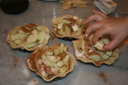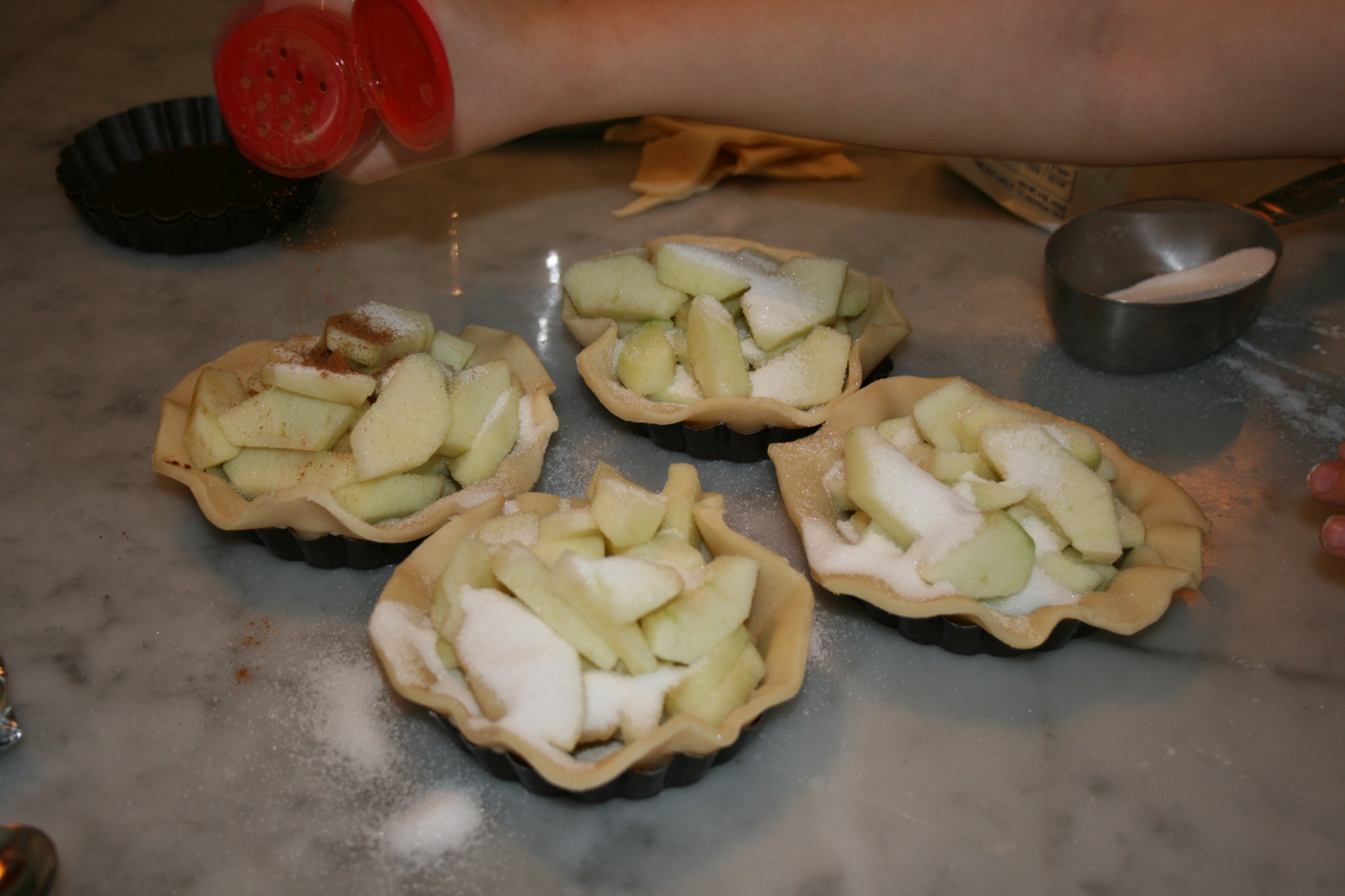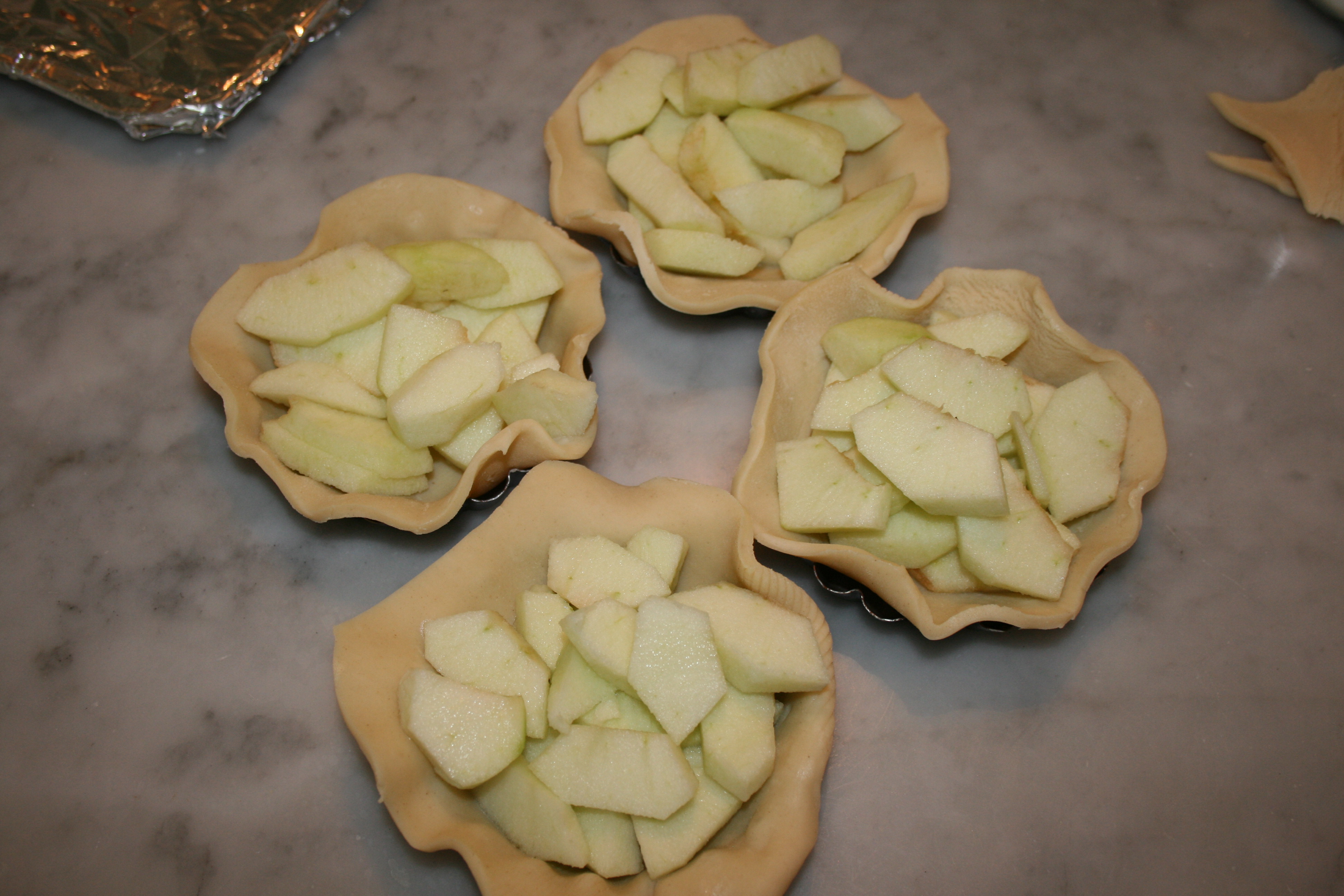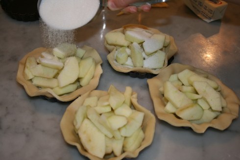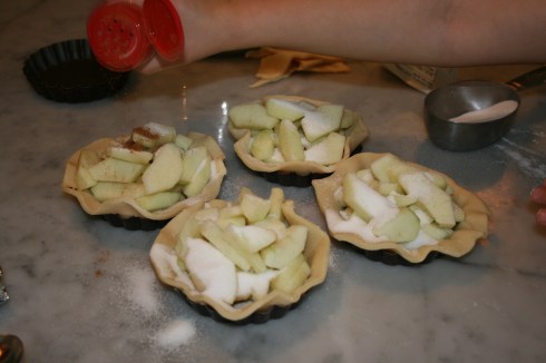 Peel, core, and slice AppLeS. Add apples to each tart.