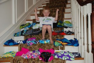 Cael with all of the bathing suits he is donating to the children who attend Camp Hope NJ!