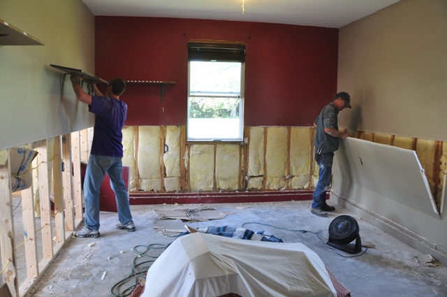 Yep…that’s right.  We had to rip this out too. (tear!)  BUT all we had to do is remove the bottom 4 feet of the sheet rock throughout the entire room (so they could put support beams up during the move).  I secretly always wanted wainscoting half-way up my office wall anyway, so this was a bLeSsiNg and not a curse, right?!