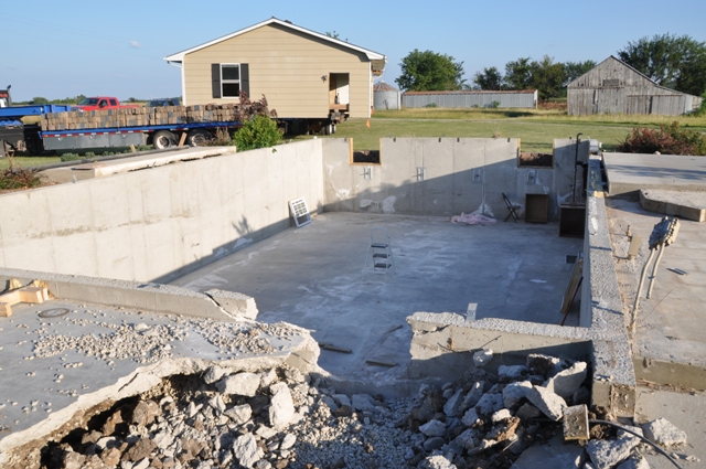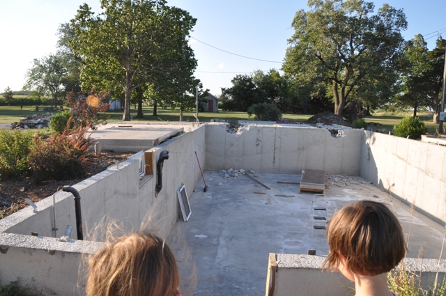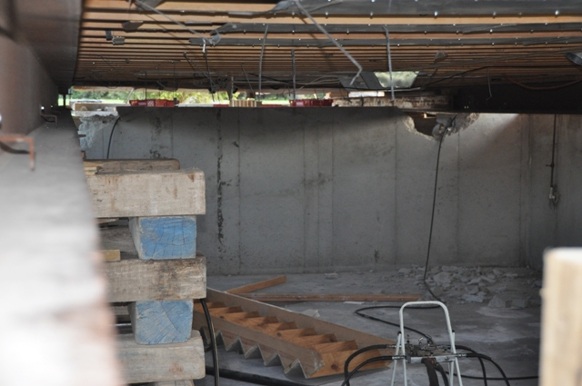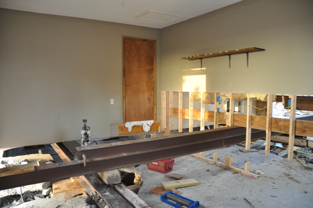 Looking into our basement. See the hole in the cement in the top right corner? They had to jackhammer out holes so the beams could slide through. YowZah!