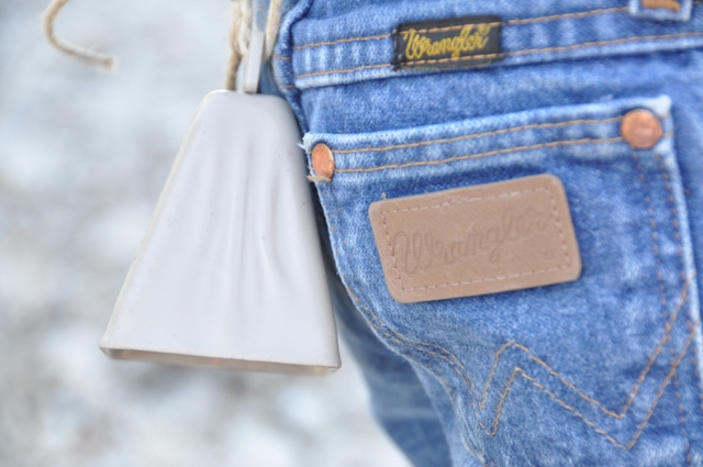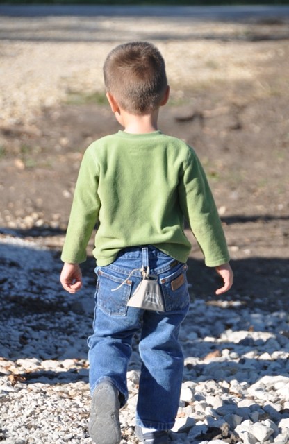 My father-in-law happened to pick up a small cow bell at an auction.  We joked about how we should attach it to Garrett since he always runs off.  One morning, after another 2-year-old meltdown, I was desperate for him to have an atTitUde change.  I grabbed the bell, tied it to his pants, opened the windows and let him loose to play in the front yard.