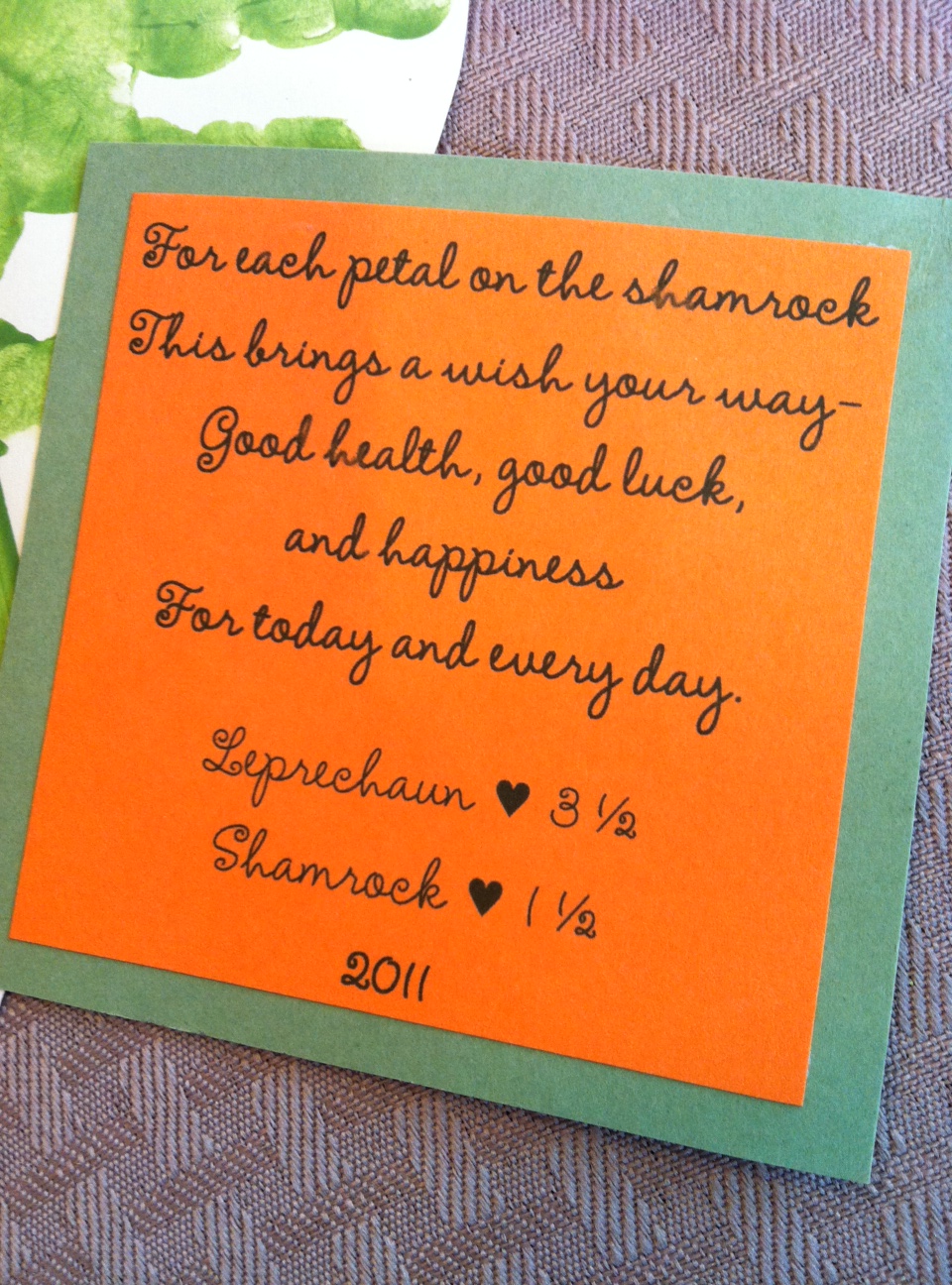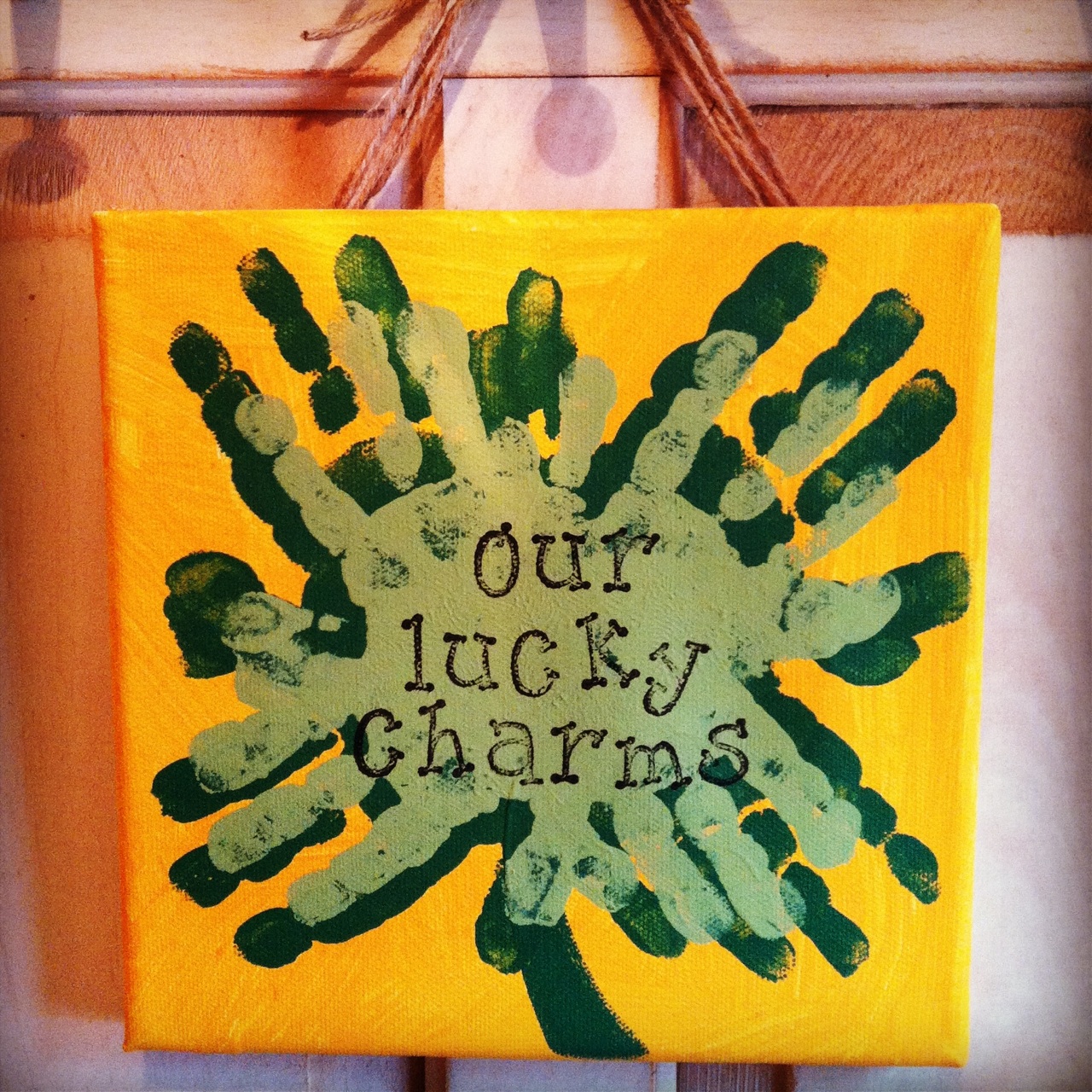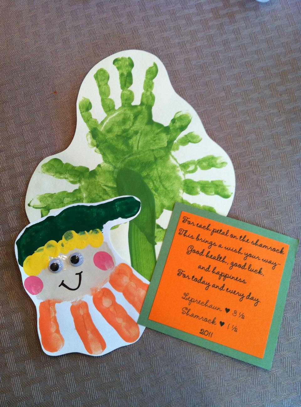 To make this shamrock I used a small canvas that I bought on sale at my local craft store. I let me son paint the background orange and then I used a different green color for each of my kid’s handprints. To add the lettering I used rubber stamps and paint! This one is my favorite!I had my son finger-paint the rainbow and color the pot of gold with crayon. Once the rainbow was dry he glued on his own “gold” coins that I purchased at my local dollar store!My son wrote his name with a white crayon and I went over it with gold glitter glue!You can do this with the shamrock and leprechaun like I did or do them separate. I had my daughter do the shamrock and son do the leprechaun so they each got to do their own thing. My son used his fingertips to do the hair and pink cheeks. I attached a cute saying and sent these to our family for St. Patrick’s Day!