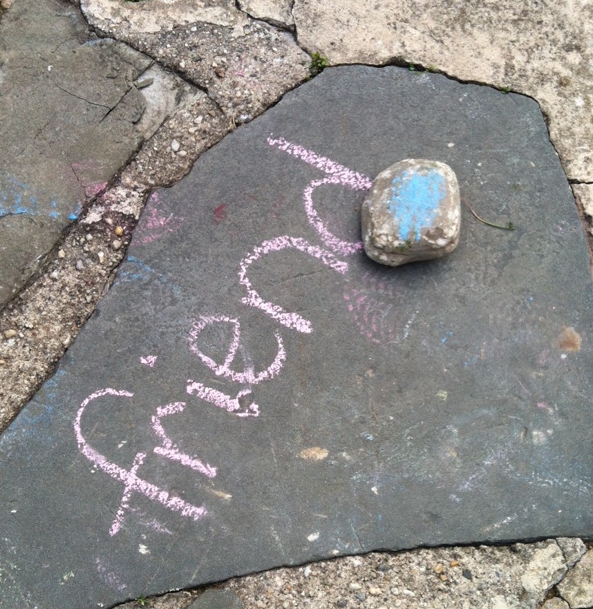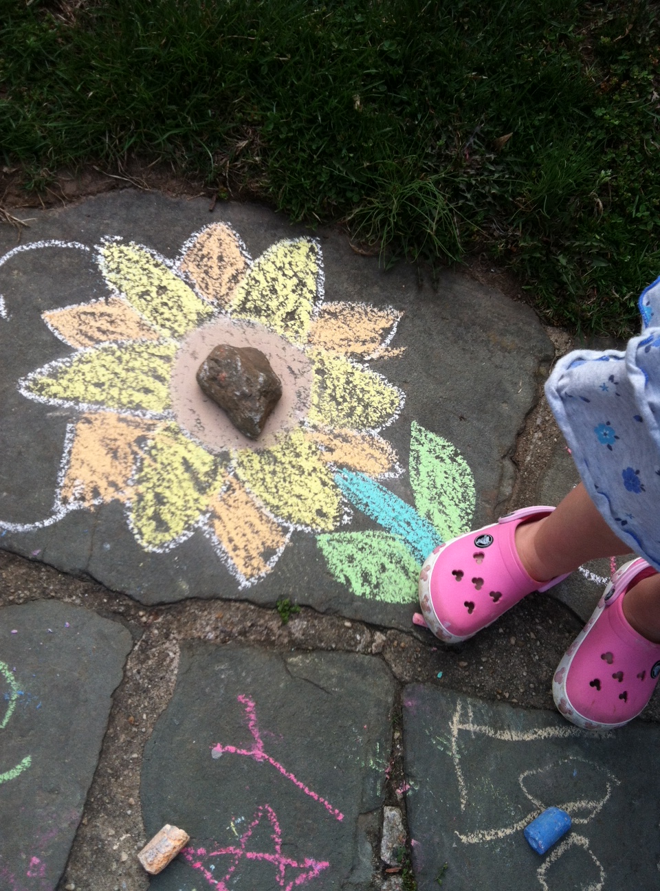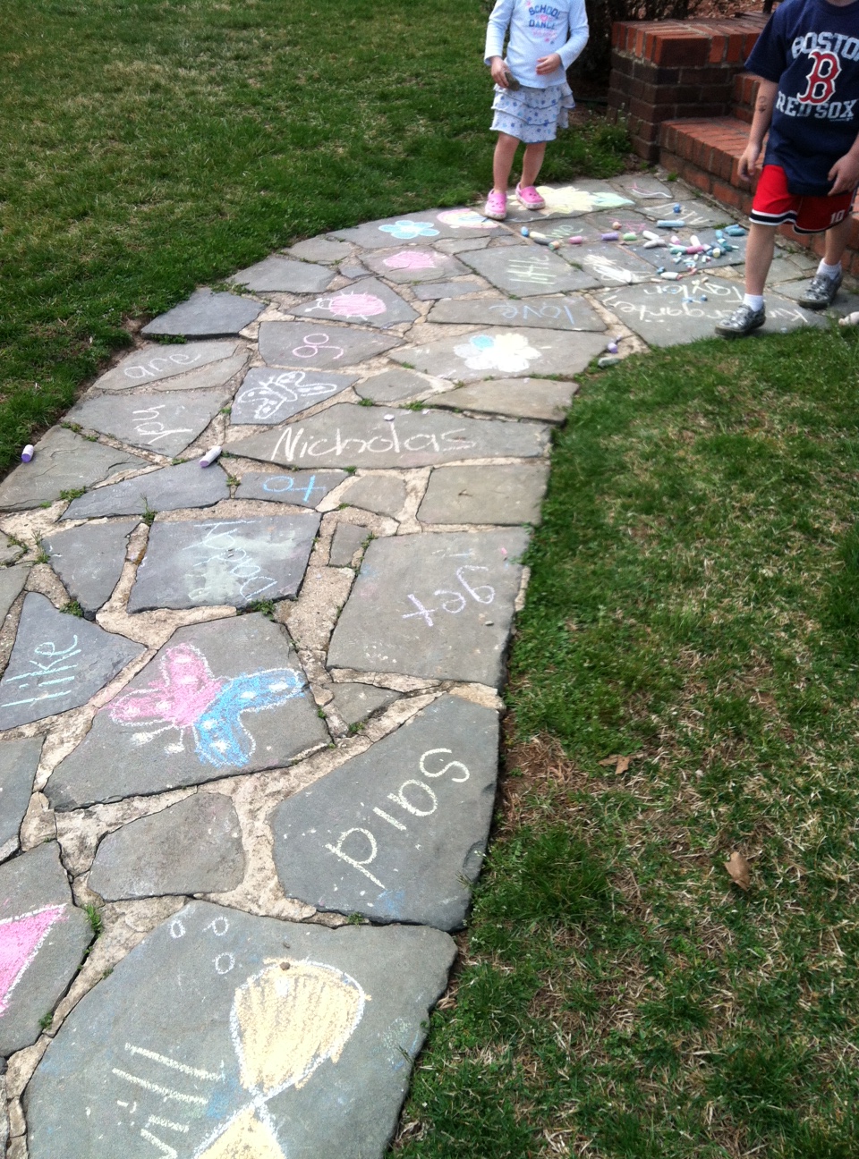 If you have a walkway similar to mine you can use each stone individually. If you have concrete you can divide it up into squares and play. I used sidewalk chalk to write down the sight words that my son is working on. I also drew some pictures for my daughter to color in to keep her busy. I had my son pick out a rock and instructed him to toss his rock onto the walkway filled with words. Once it landed on a word he had to run to it, say the word, then bring the rock back to me. It was such a simple game, but it kept him busy and helped him practice his words!