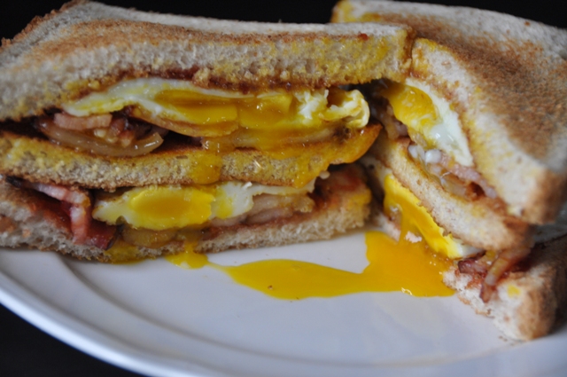 3)Stack the egg and bacon in between your bread and cut at an angle.