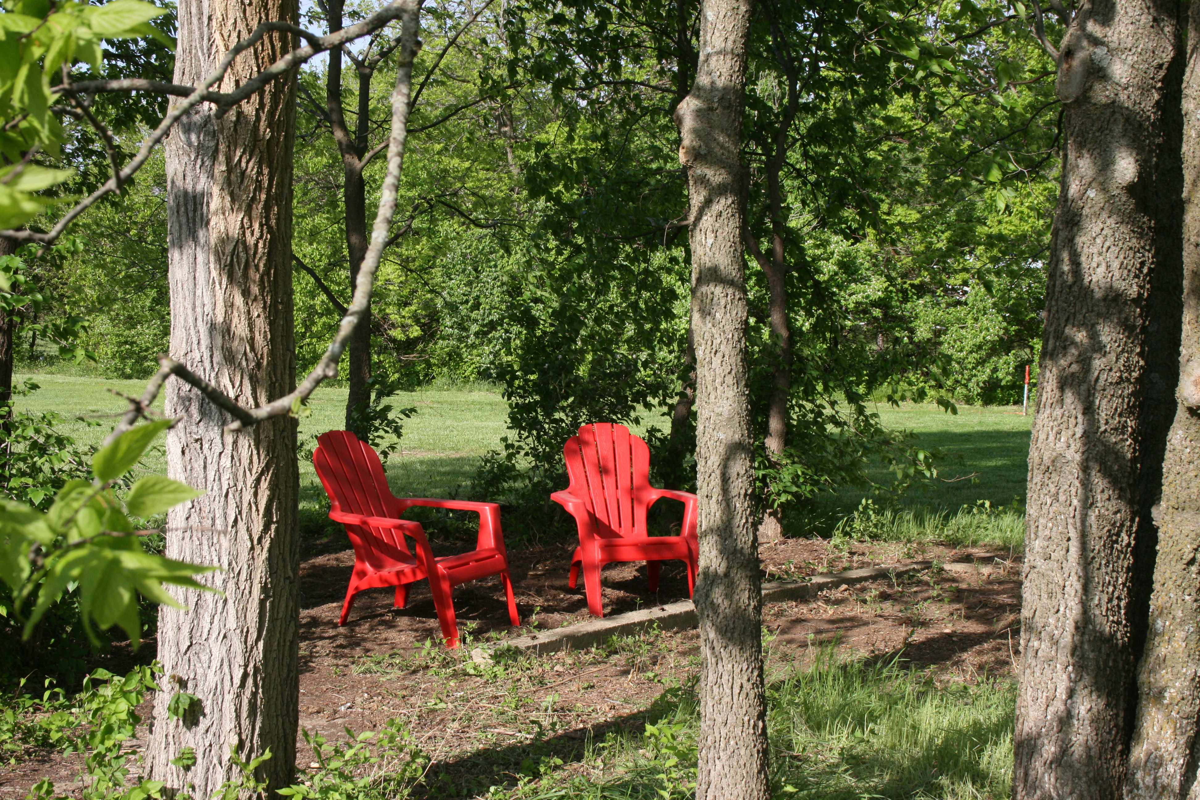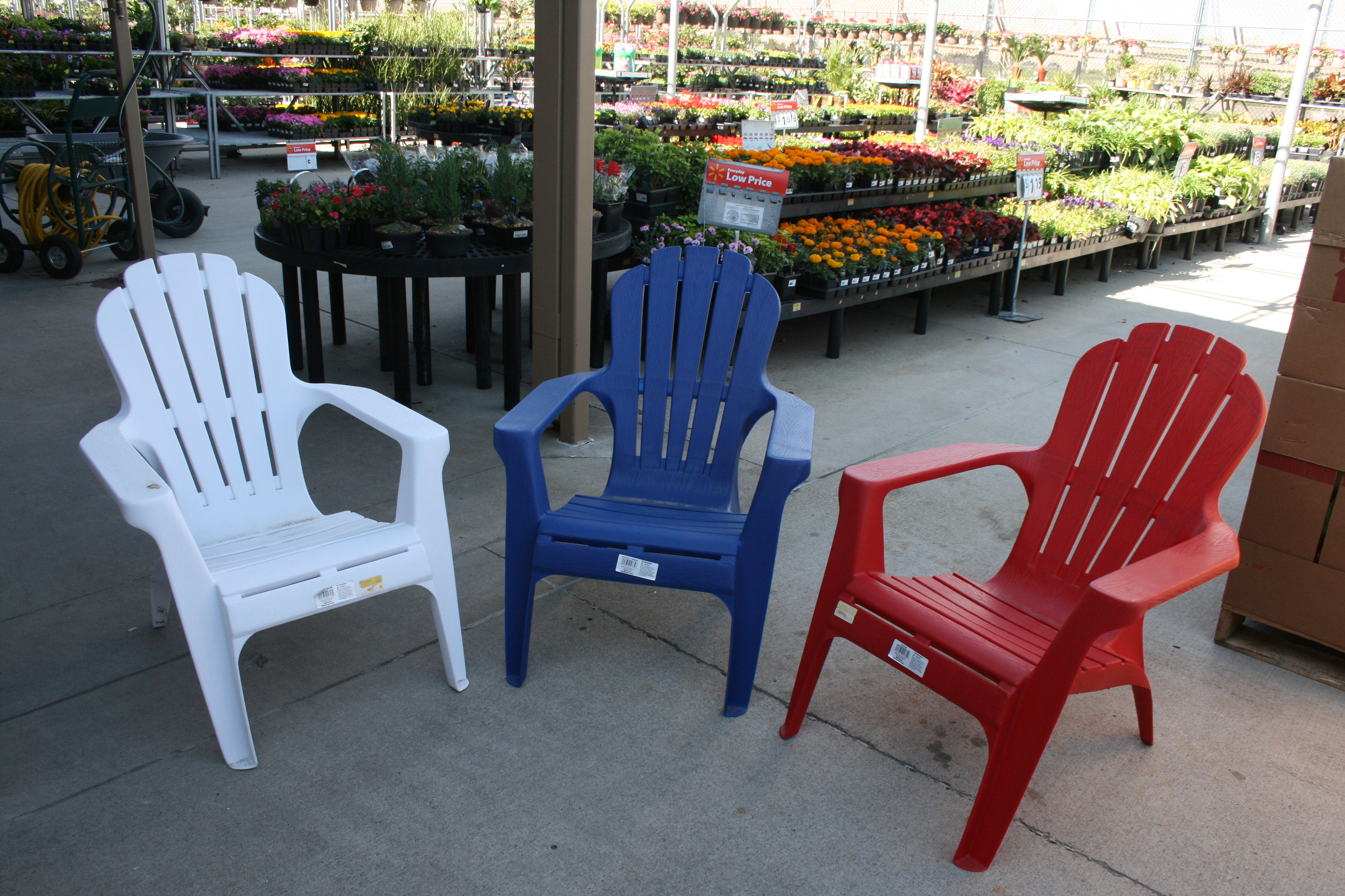 I was looking for a couple of chairs for a tree grove in front of my house and these plastic Adirondack chairs from Walmart were perfect. The white and red chairs were $15 and the blue chair was $14.